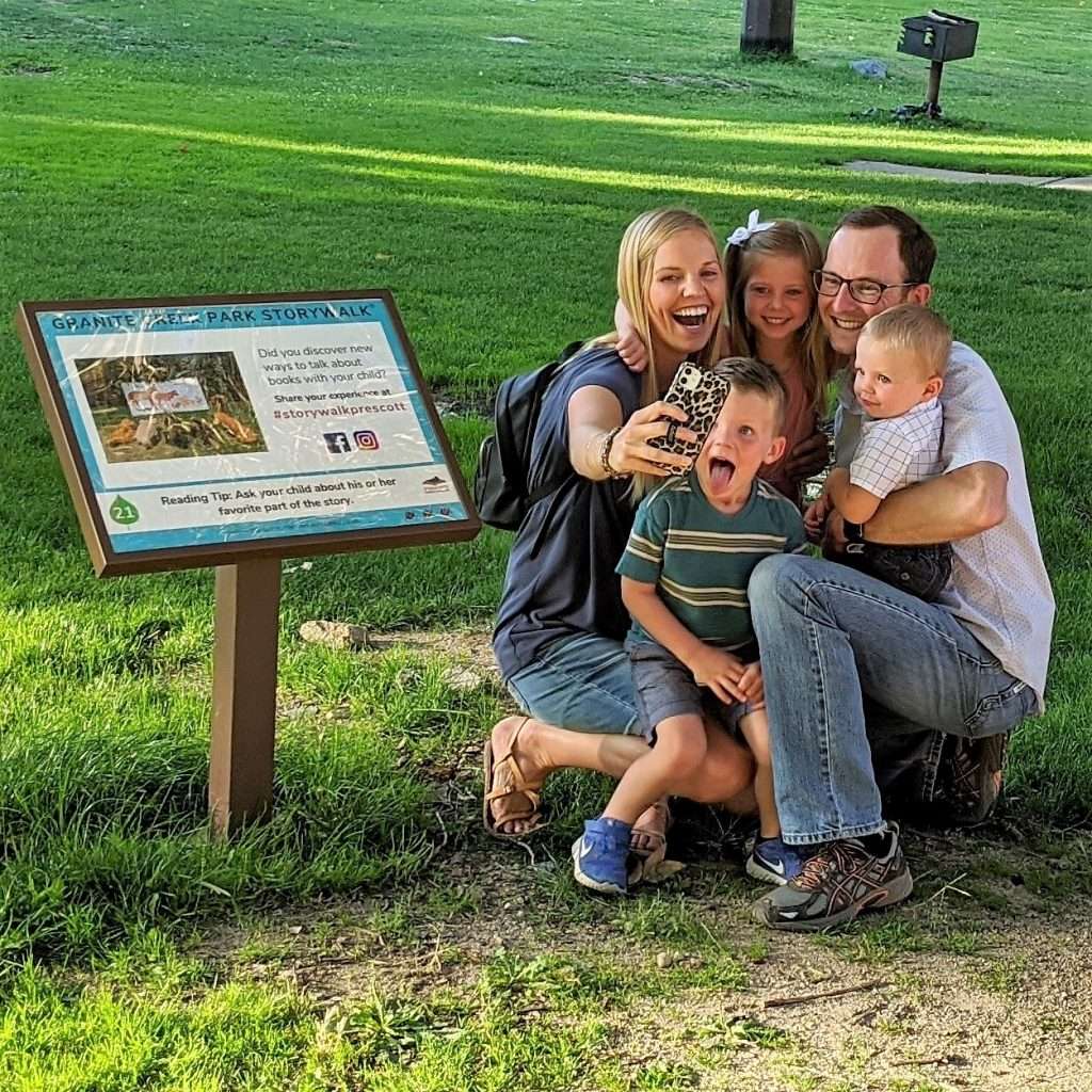 Not only does a StoryWalk® offer a joyful outdoor reading experience, it promotes reading discussion and encourages physical activity as adults and children step through the pages of a book in a natural setting. Come out to Granite Creek Park and discover the joy of reading, and share your experience with us on Facebook or Instagram – #storywalkprescott.